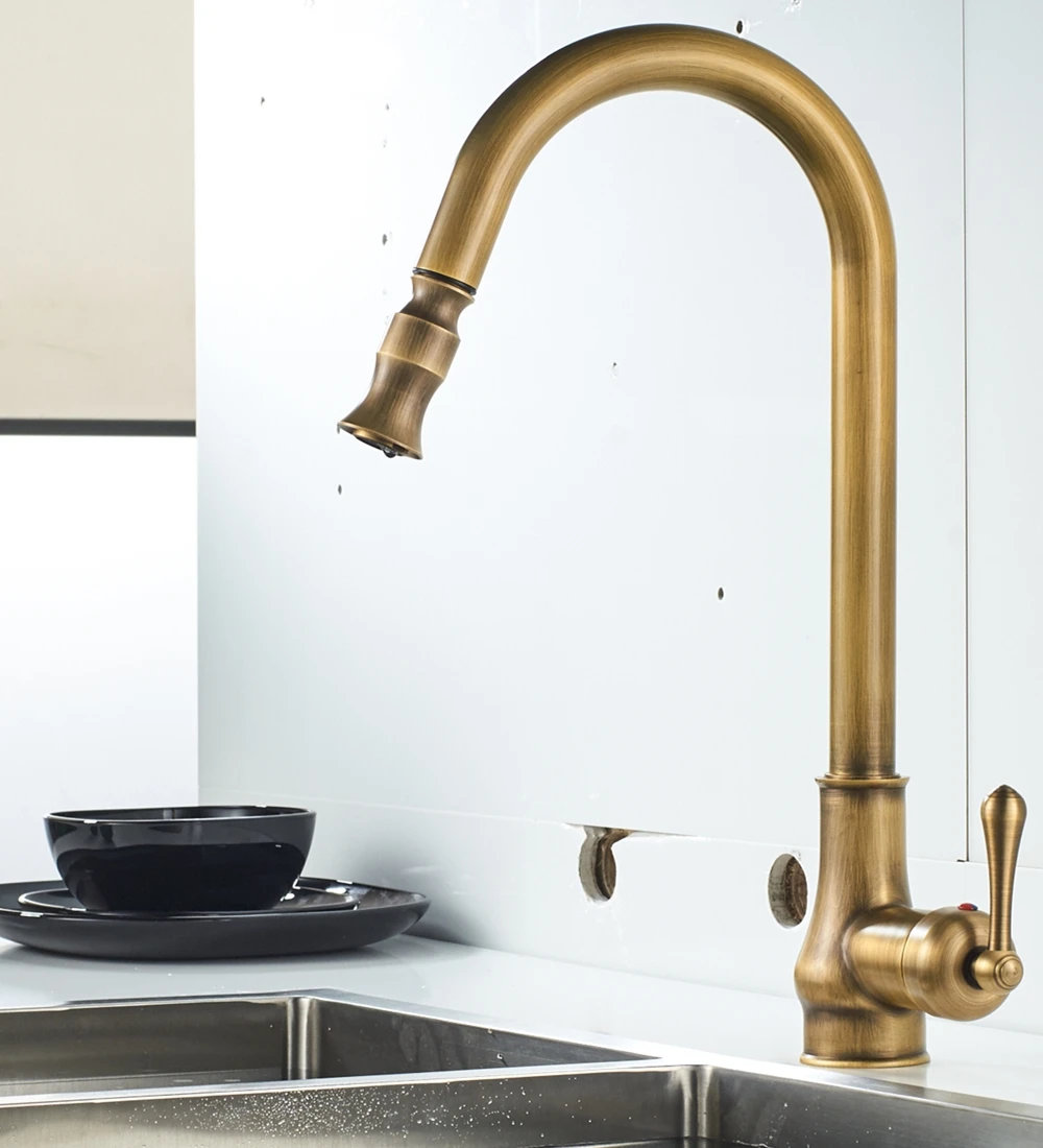 Pull Out Hot and Cold Water Tap Europe Antique Brass Mixer Sink Swivel 360 Degree Mixer Pull Down Kitchen Faucets Single Hole