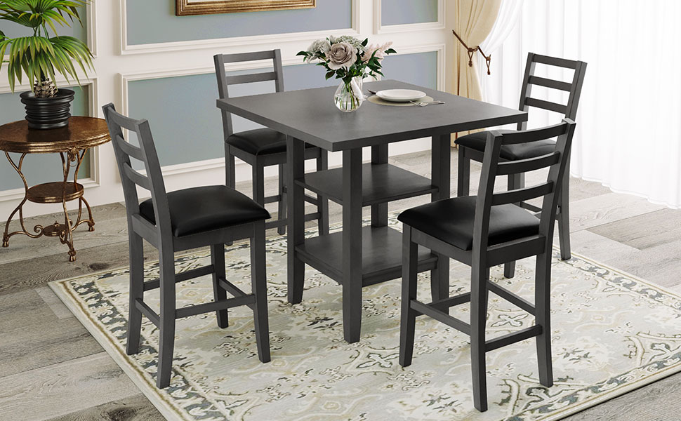 Merax 5-Piece Square Dining Table Set with 2-Tier Storage Shelving and 4 Padded Chairs, Kitchen Dining Room Table and Chair Set for 4 (Gray)