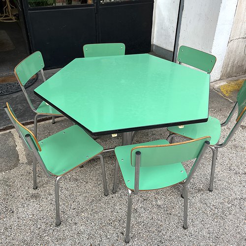Hexagonal nursery table with 6 Formica chairs, Italy 60u0027s