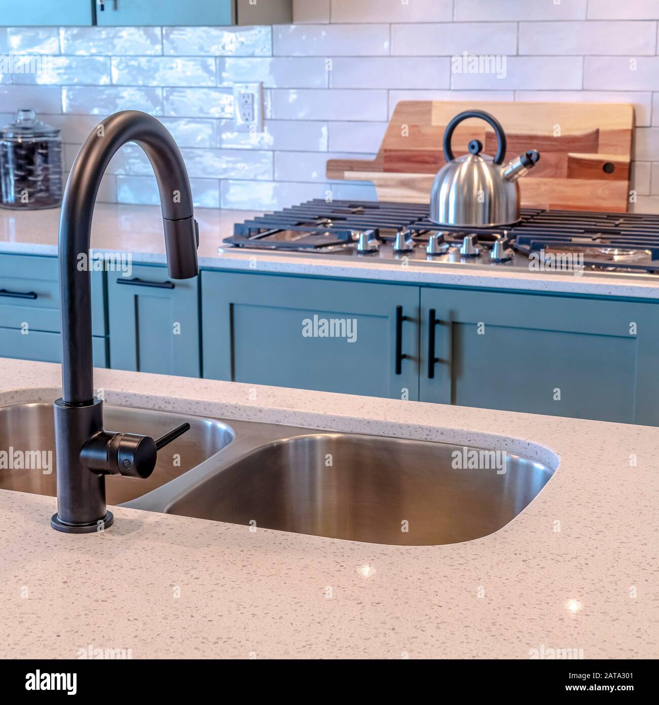 Black Faucet And Double Bowl Kitchen Island Sink Against Cooktop