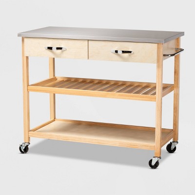 2 Drawer Cresta Pine Wood and Stainless Steel Kitchen Island Utility Storage Cart Light Oak/White – Baxton Studio