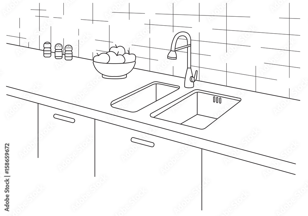 Kitchen sink. Kitchen worktop with sink in line style. Vector