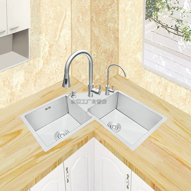 Thickened Kitchen sink 304 Stainless Steel Corner Sink Double Bowl Above Counter Basin Corner Sink Double Basin With Faucet