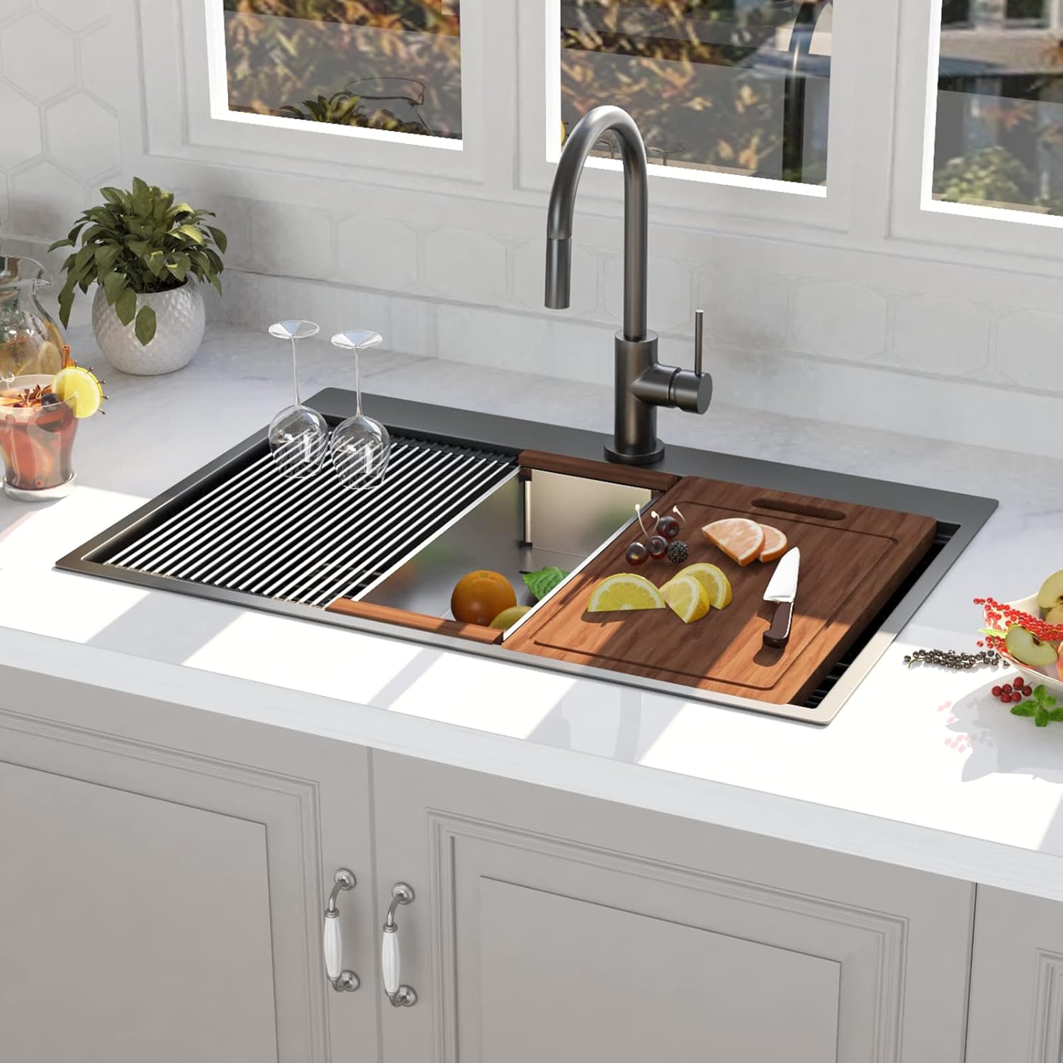 33 Inch Black Drop In Kitchen Sink, HERCATE 16 Gauge Stainless Steel Workstation Sink, 33″ x 22″ Topmount Single Bowl Sink with Accessories