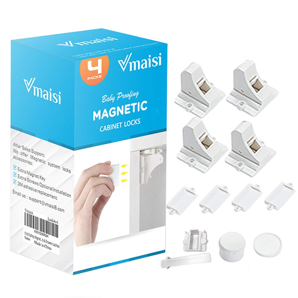 Vmaisi Safety Magnetic Cabinet Locks (4 Locks + 1 Key) Bundle with Extra Baby Proof Magnet Key, Work with Adhesive for Kitchen Cabinets, Drawers