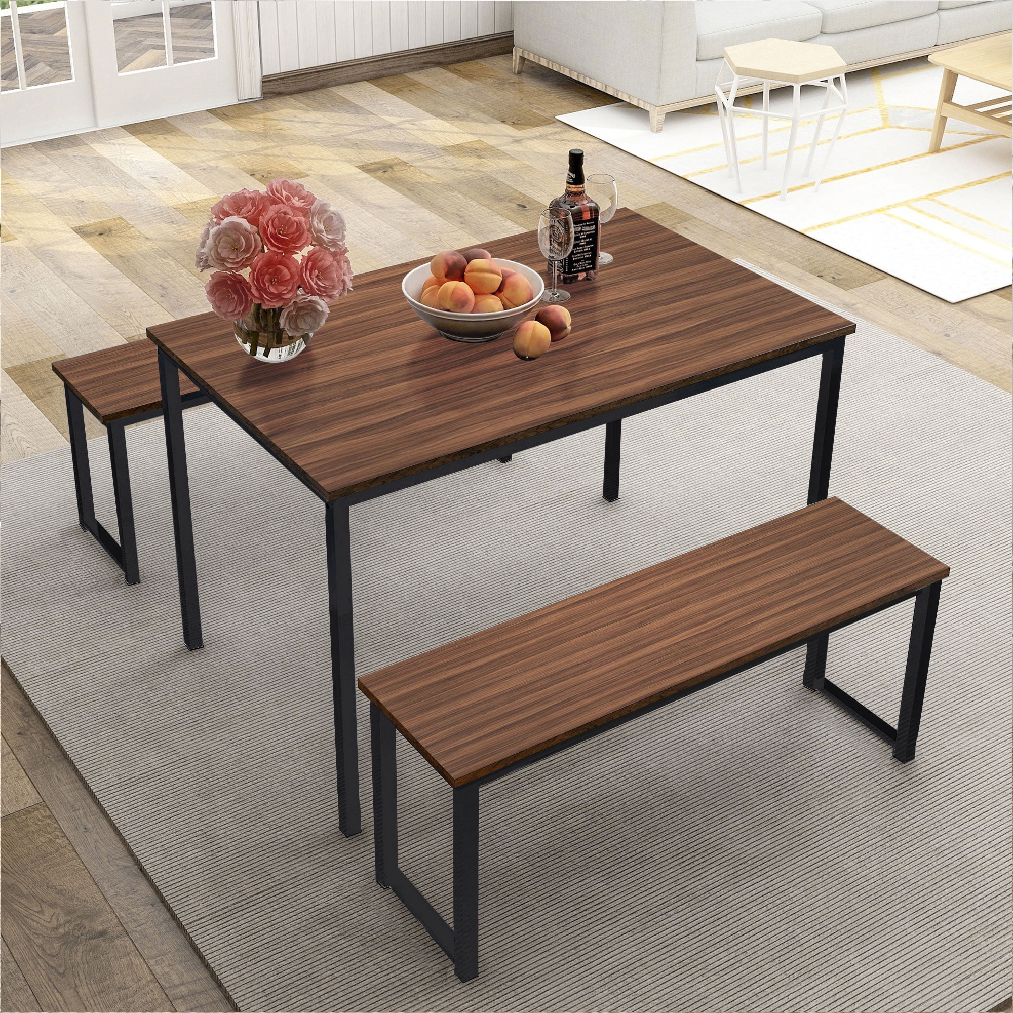 ENYOPRO Kitchen Table Set, 3 Piece Dining Table and Benches, Small Rectangle Studio Desk Set, Wood Table Top with Metal Frame and 2 Benches for