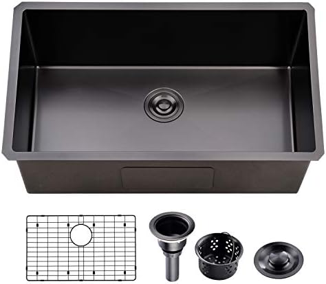 Ufaucet 32 Inch Nano Black Undermount Kitchen Sink, Zero Radius 16-Gauge Stainless Steel Commercial Single Bowl Wet Bar Prep Sink with Drainer and